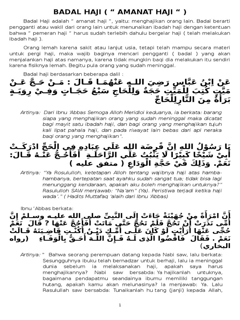 Badal haji merupakan praktik peribadatan haji seorang jamaah yang dilakukan oleh orang lain dengan ketentuan haji pada umumnya. Rehadis tentang badal haji 20051122 1356 Alaikum salam warahmatullah wabarakaatuh tentang Badal Haji sudah Ijma seluruh Imam Madzhab Ahlussunnah waljmaah untuk memperbolehkannya dengan sedemikian banyak hadits shahih diantaranya antum dapat merujuk Shahih Muslim Juz I Bab. Untuk lebih jelas berikut ulasan singkat terkait dengan dalil sekaligus juga hadist yang berkaitan dengan haji.